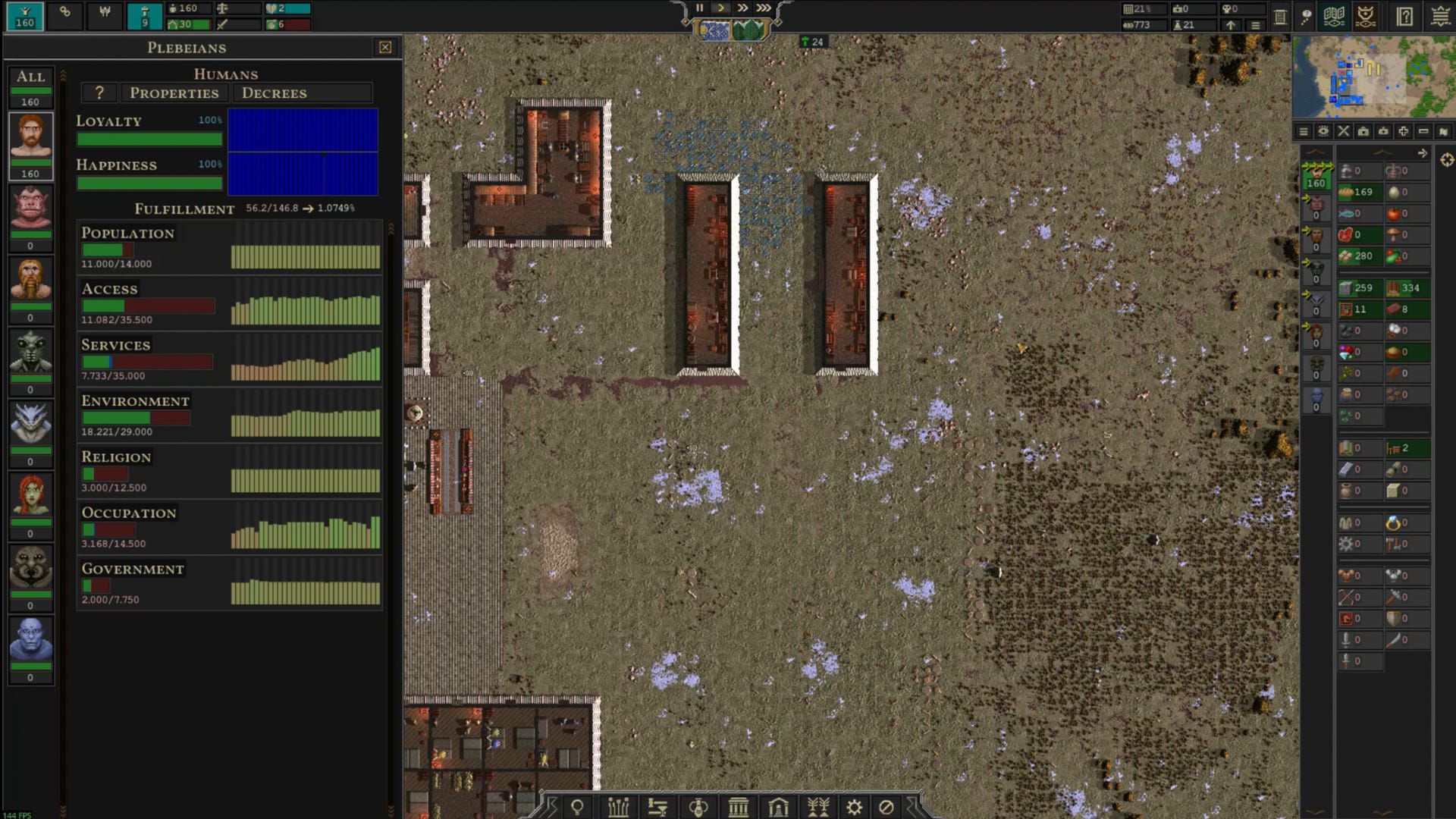 Colony sims from the past decade often include a control for selectively increasing the simulation speed, but even those are limited by the programmatic complexity of their games’ systems — it’s one thing to play RimWorld at three times normal speed, but one third of a long-ass interval is still pretty long. That brings us to one of Songs of Syx’s most impressive innovations: press the “4” key, and the simulation speed is multiplied by twenty-five. Still fiending? Press it again, and caution is thrown to the wind as the multiplier increases to 250. In a matter of seconds, whole farms are tilled and sown; sprawling city blocks are erected from bare earth; entire forests are felled and their timber hauled away. I can’t overstate how satisfying this gets once when you develop a feeling for it — after you’ve built up some comfort with the core systems and start wrangling the speed controls, you can play this game at damn near the speed of thought. It makes SoS dramatically more time-efficient than its genre peers, and it’s an astounding feat of technical optimization.