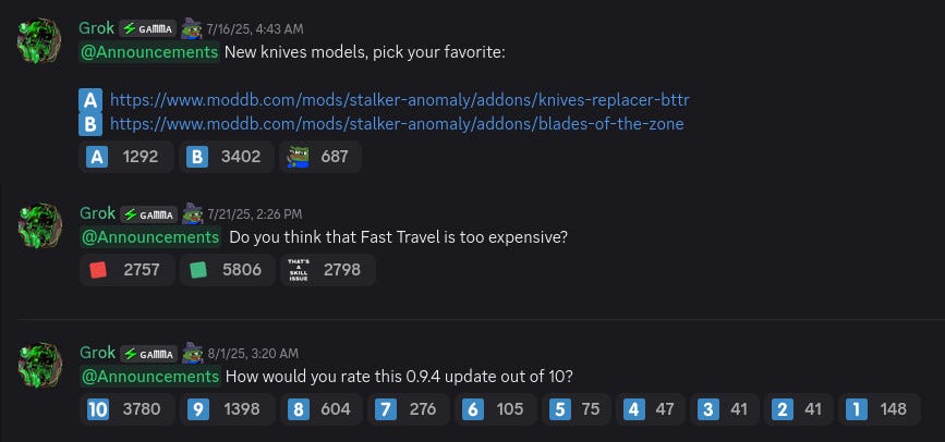 As I presaged earlier, it’s my opinion that S.T.A.L.K.E.R.: Shadow of Chornobyl is one of the most important video games ever made. That its popularity endures nearly two decades after its original release is testament to this, and the mind-boggling dedication of its modding community is yet more so. I haven’t even mentioned other huge and comparably popular Anomaly modpacks like Escape from Pripyat and H.A.C.R., both of which I still need to try. Together, these projects represent what I see as a glimpse into the future of independent game development in this dawning era of deprofessionalization. G.A.M.M.A. definitely has a certain auteur energy to its curation and presentation, but it’s a deeply collaborative endeavor at heart. Just look at this sample of community polls from the official Discord server: