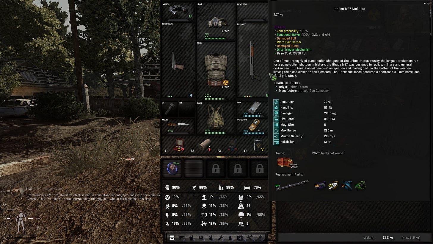 G.A.M.M.A. doubles down on one of SoC’s more underdiscussed design choices, namely character progression through carefully choreographed itemization. Rather than training a set of skills and increasing your character’s intrinsic power, progression is based on very precise and thoughtful control over when you get better equipment. In the original games, this meant that you’d find more powerful guns and armor for sale only after completing certain story prerequisites. G.A.M.M.A. instead removes weapons and armor from traders altogether, compelling you to scavenge whatever kit you intend to use. Crucially, weapons and armor found in the wild or taken from fallen stalkers are almost always in a terrible state of disrepair. If you try to use them anyway, your guns will constantly jam and your armor won’t deflect so much as a stiff breeze. The repair system is exceptionally detailed. You buy or scavenge the individual parts, or create them using the repair kits corresponding to the tier of item in question.