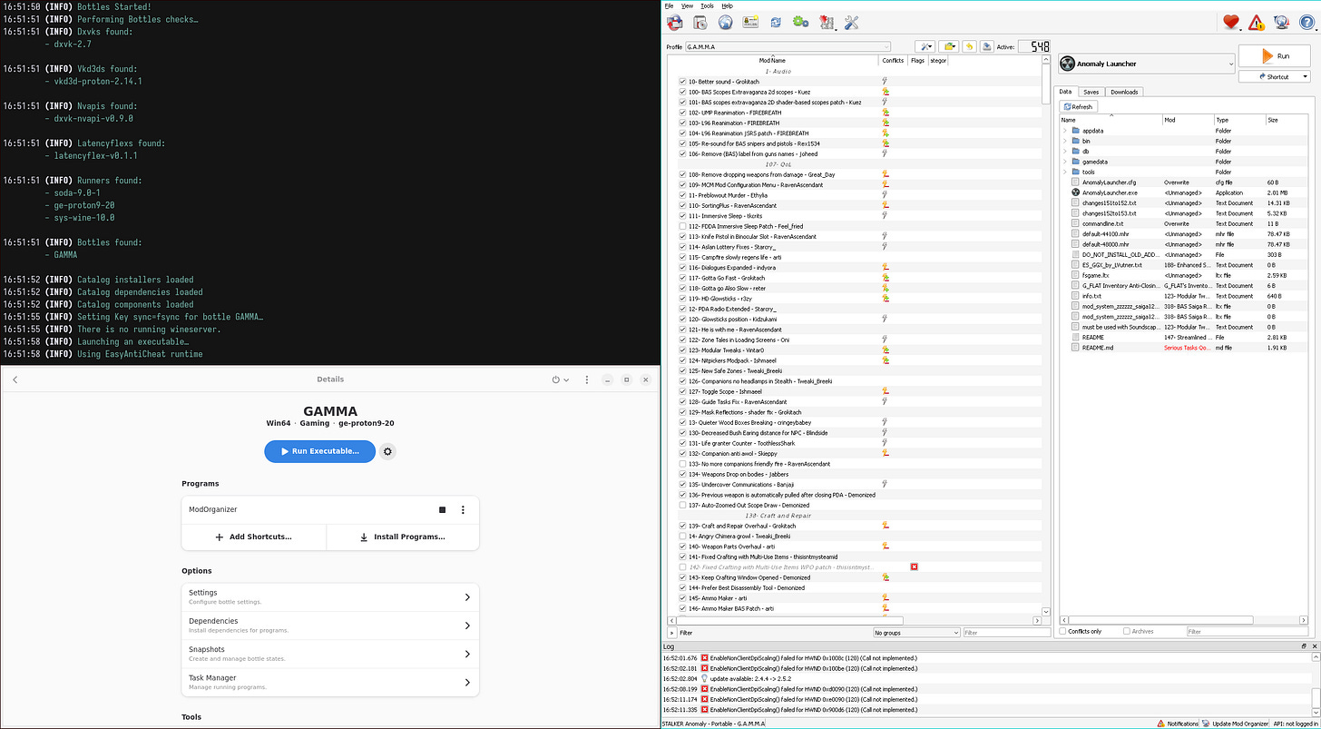 That brings us to Grok’s Automated Modular Modpack for Anomaly, or G.A.M.M.A. for short. To play it, the would-be stalker need only run the titular creator’s automated installer script, which autonomously downloads Anomaly and then patches it with hundreds of community-made enhancements. At time of writing, the official modlist contains an eye-watering 458 individual addons, pre-configured by the venerable Mod Organizer 2 with which PC game-modding grandees will be familiar. I finally figured out how to get it all running correctly on Linux so, this week, we’re going to dive in headfirst and see just what all of that gets us. Short answer: easily the best survival-shooter I’ve ever played. Long answer: hoo, boy… buckle in.